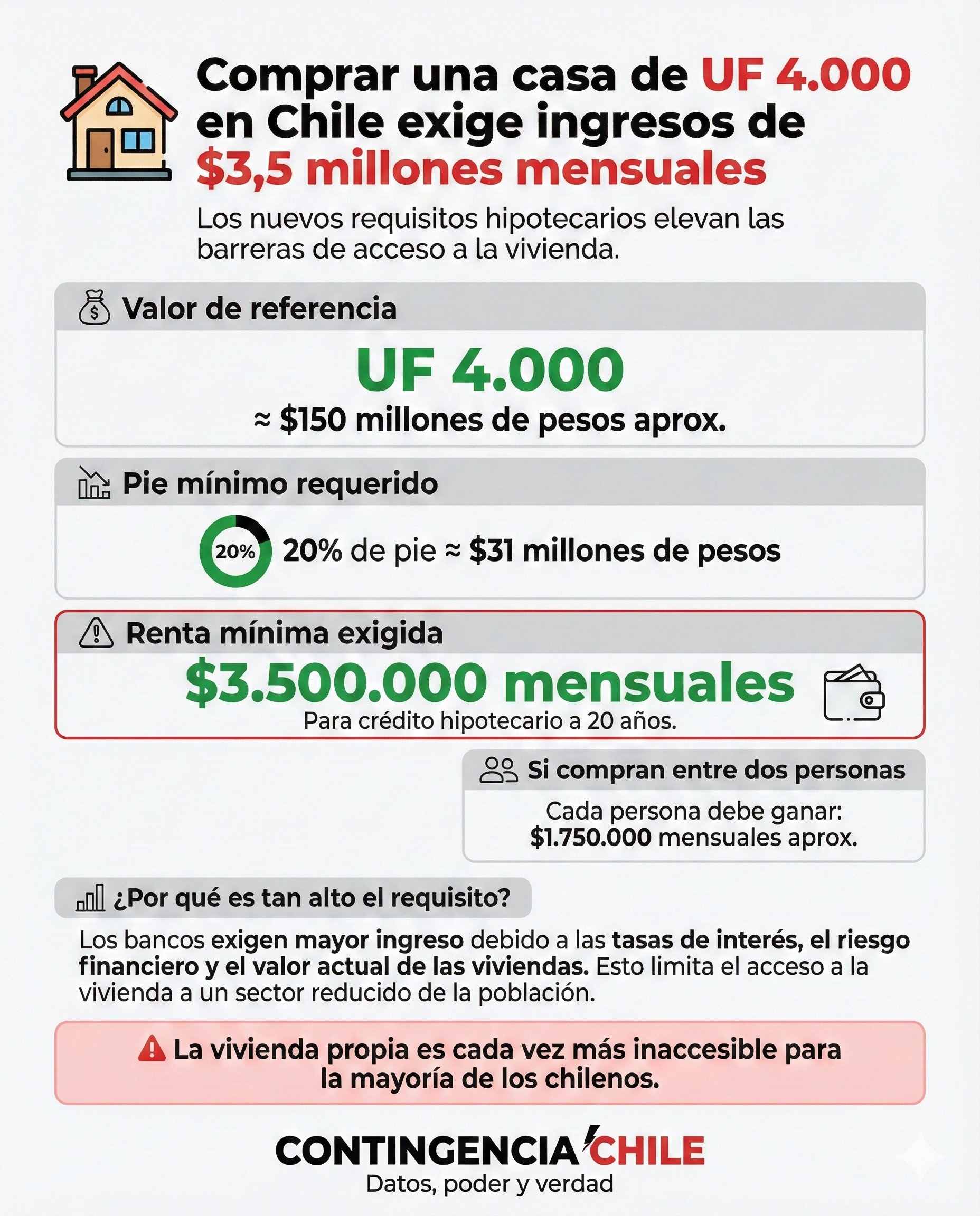 El acceso a la vivienda propia continúa alejándose de una parte importante de la población en Chile. Actualmente, para acceder a un crédito hipotecario destinado a la compra de una vivienda de UF 4.000 —equivalente a aproximadamente $150 millones de pesos— los bancos están exigiendo acreditar ingresos mensuales cercanos a los $3.500.000.